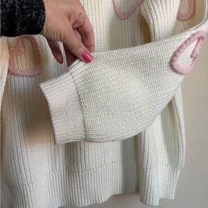 Scoop neck cream sweater with large pink braided heart embellishments throughout. perfect date or Valentine’s Day piece, oversized fit