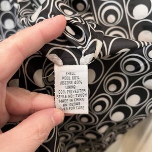 Preowned, no holes but there are a couple of surface spots on the left sleeve, this jacket is black and is wool so there is fuzz/lint/etc on the jacket that does just naturally attract to the jacket, see photos for condition