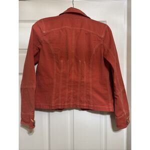 The Tulle Anthropologie Women's L Cotton Button-up Short Jacket in Melon Pink/Red is a stylish and versatile piece perfect for casual or business occasions. Made from breathable cotton with a solid pattern and contrast stitching accents, this jacket features a collared neckline, long sleeves, and convenient pockets. The button-up closure adds a classic touch to the jacket, which is easy to care for with machine