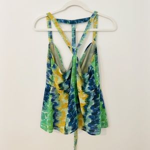 Lined flowy lightweight blousy tank. Gently work (4-6 times) BUT is missing a snap used to pull the fabric over the chest together. Can wear with a bandeau or easily replace the snap. 100% polyester shell & liner