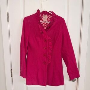 Chic fuchsia jacket with ruffled collar. Elegant design by Tulle.