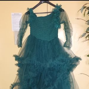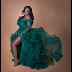 Oyemwen emerald green tulle robe off the shoulder in size L with stretch back. Can be worn open or close in the front using snap closure. Great for photoshoot, birthday, wedding, or baby shower.