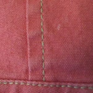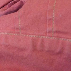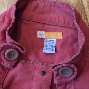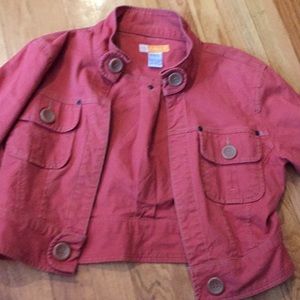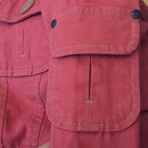 19.5" bust 16.5" length Soft rusty red stretchy short jean jacket with back pleat and tan buttons. No rips tears or fraying. A tiny light spot on the left bottom... see pictures. It is barely noticeable . Not perfect but perfectly lovely. The size is large, but I’ve added medium for exposure and because I think it may fit many mediums