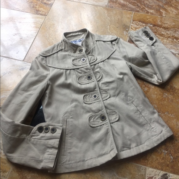 Bust 18” Length 22” across the hem 19” Oatmeal/beige Cotton jacket w/pockets modern military style w/faux epaulets antiqued bronze buttons, vented & faux Belted in the back The size is medium, but I’ve added sizes for exposure extra button pack is in left pocket