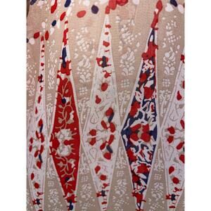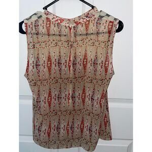 This eye catching top by Tulle is semi-sheer with a geometric pattern. The bold geometric patterns in the rest of the shirt are tan/navy/red. Shirt is shortsleeved.