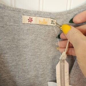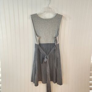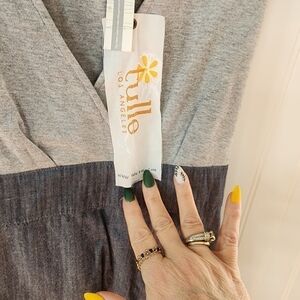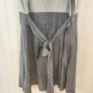 Tulle los angeles sleeveless dress with beautiful low v- neck where the top half is a soft gray cotton, bottom half is a lightweight blue chambray color that ties around back w/ metal buttons going down half way on one side of bottom. NWT SIZE XL