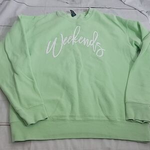 This is a homemade Weekends sweatshirt. This is a size Medium. It is just a fun shirt to show the love of the weekend that most of us have! It is a fun mix of a le green and a mint green being a great color!