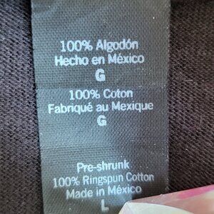 Never worn, tags were removed so it could be washed as it was in storage. Size large, 100% Cotton, not stretchy. Pit to pit measures 20.5 inches.