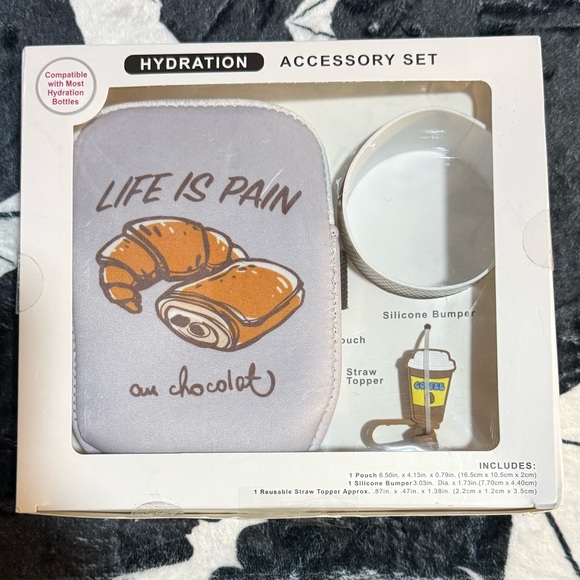 Hydration accessory set featuring a croissant design. Includes a pouch, silicone bumper, and straw topper. Perfect for hydration bottles.