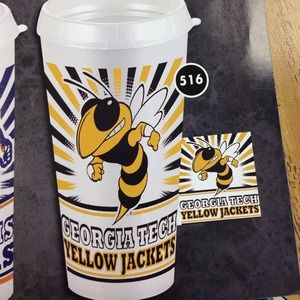 32oz. Can be used for hot or cold drinks. Can put a straw through it or drink normally. Many more designs besides the ones shown!