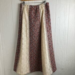 Absolutely stunning three piece skirt set by Tumbleweeds. Size large based on measurements listed below. Set includes skirt, top and waist tie. Just stunning. Almost a paisley print in the color blocked areas with light glitter detailing. No flaws. Next day shipping.