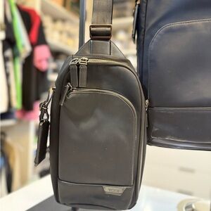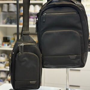 With less than a year of use this combo has been one of my favorites! So clean and good looking. Tons of pockets and space. Tumi is still one of the best quality in the market. It still has factory warranty for another 4 years. Backpack Retails for $595 and Sling $395. The condition is really good. It has EB debossed on the name tag, but Tumi it’s super easy to replace as it’s a peel and stick you can even get on amazon or walk into a store. Get the combo for a steal.