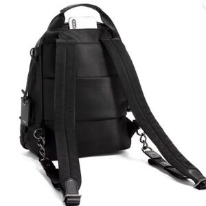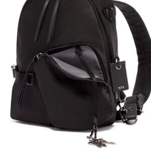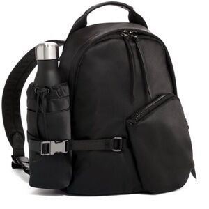 Sleek black backpack. Features multiple compartments. Comfortable straps.