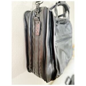 Classic black leather briefcase with padded laptop compartment and multiple interior sections. Features zip closure and comes with both nylon and leather adjustable/removable shoulder straps. Includes original TUMI travel luggage tag.