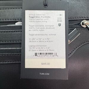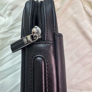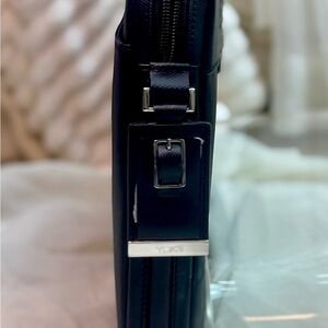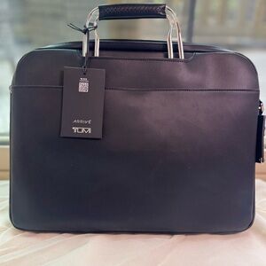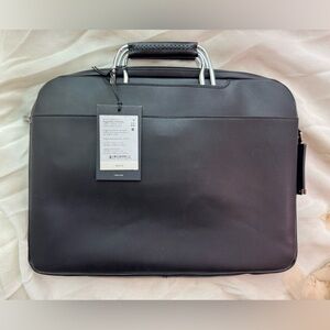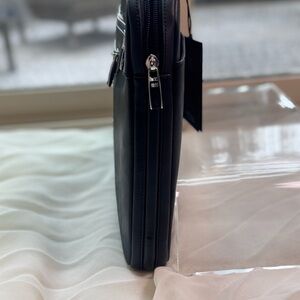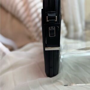 Elegant black leather design. Perfect for business needs. Features multiple compartments.