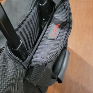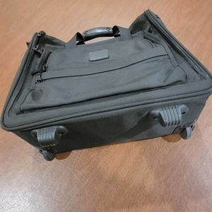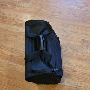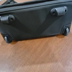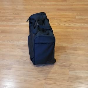 Sleek black rolling travel bag. Durable design. Easy to maneuver.