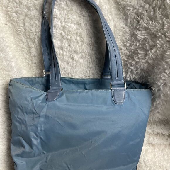 Tumi Blue Nylon large tote with leather trims and straps silver tone hardwares. Front top zipper the inside lining has a side zipper and a detachable wallet.pre owned in good used condition signs of wear on the bottom leather part of the bag see all pictures any questions please message.F1