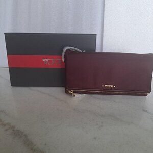 Exterior: Foldover flap with snap; Zip pocket on flap; Back slip pocket; Leather wristlet