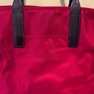 Stylish Tumi tote in vibrant crimson. Features sleek black straps. Ideal for daily use.