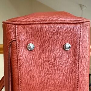 Stylish Tumi tote in burnt orange leather. Features dual handles, plenty of pockets, can fit a lot (see pictures of what can fit) and a detachable strap. There’s a sleeve to be able to attach to a carry-on Perfect for everyday use and travel. Comes with the original Tumi dust bag.