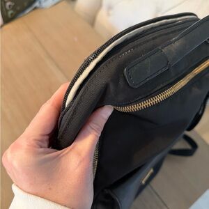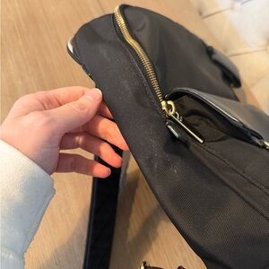 Elegant black backpack featuring gold zippers. Ideal for daily use.
