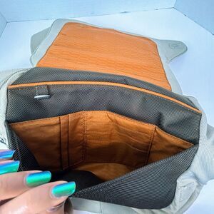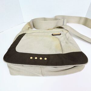 Tumi T Tech flow flap crossbody bag in beige nylon. This lightweight slim messenger bag is perfect for casual everyday wear, hiking, or travel and includes a back section to thread a water camel bak bladder into for outdoor adventures. . A myriad of pouches and pockets keep you organized - the front exterior includes a small zip pocket and the back exterior includes one roomy slip pocket. Front flap with magnetic closure opens to reveal two slip pockets and a D ring to hold keys. One slip pocket includes multiple credit card slots, slip pockets, and pen holders. Top zipper includes a roomy interior with one mesh zip pocket. Go on your next hiking or camping trip in style with everything in its place! Approximate measurements: 12"L x 11.5"H x 2.5"D, up to 29"adjustable shoulder or crossbody strap drop. Decent to fair used condition, bag functions as it should but has significant demarcation to corners and edges due to age and wear.