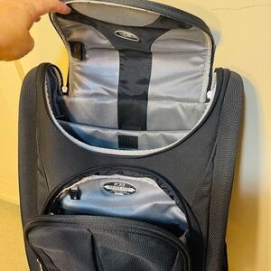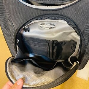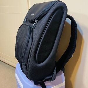 Elegant black backpack with sleek silver zippers. Ideal for travel and daily use.