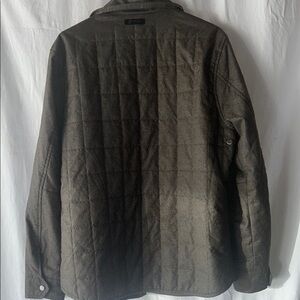 Elegant dark brown jacket with quilted design. Features button closure and zip pockets. Ideal for layering.