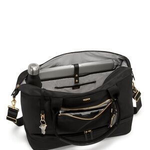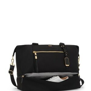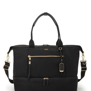 Used once on a trip. Changed my hand luggage and this no longer matches - that's the only reason I'm selling. I see a couple scratches on the bag and the feet on the bottom but basically looks new otherwise. It's a wonderful bag, perfect for long weekends, work trips, and travel in general. Looks super chic with the black and gold accents. Slips conveniently over luggage handle for easy travel.