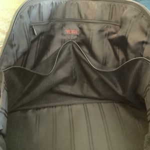 Large Tumi black weekender tote with ballistic nylon exterior, and leather handles. Large exterior pocket with alternate pocket to slip onto luggage handle. Interior: 1 Large zippered mesh pocket, 2 smaller open mesh pockets, and 1 zippered pocket. Expandable sides, 2 exterior zippers full length of bag. Protective leather bottom, edges and handles. Sturdy, used but in fair condition. Leather is worn in several spots. Rough measurements of dimension: 12.5” deep, 22” long, 9” wide.