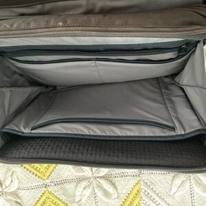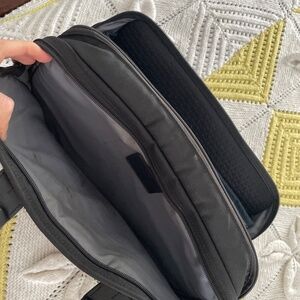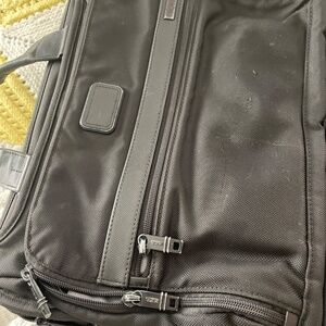 Tumi nylon briefcase. Excellent for carrying a laptop and a good amount of papers or books. You can see how it nicely expands in the middle. There are three external zipper pockets as well as internal zipper pocket. As you can see it on one side, there are several marks, that look like something dripped on it. They are less noticeable in real life than in the photo due to the light, but they are still noticeable. You can also see a couple. Mark The other side. The handles also show some wear . But this is truly an excellent bag and has many years of life left.