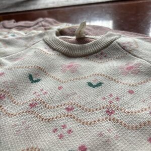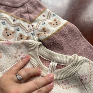 Adorable kids' sweaters featuring charming patterns in pink and cream. Perfect for keeping your little one cozy and stylish.