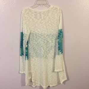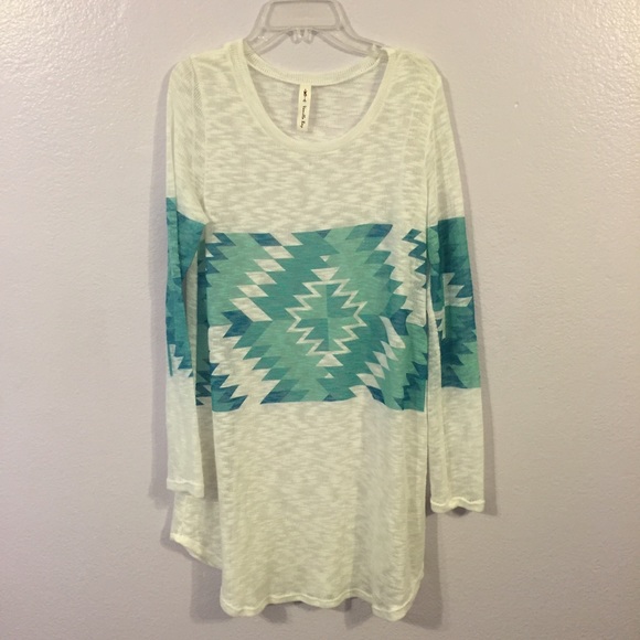 Vanilla Bay Aztec print tunic. Great for winter and spring. Can be dressed up of down. This was worn once then hand washed per the instructions. There is a flaw in the front (pictured). It looks like a hole but it's just discolored. It is not noticeable when worn.