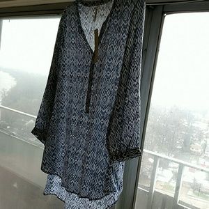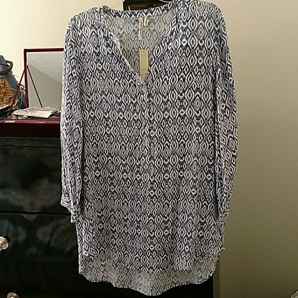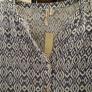 Blue and white tunic V neckline. Gold Tone buttons. Looks great with leggings or jeans.
