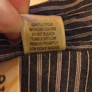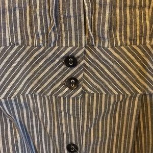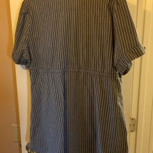 Grey & white striped button down tunic. Very flattering on. The size tag has faded but it's a definite 3X. The tunic runs smaller. Bow design at sleeves. Bought from Macy's. It's super cute on! Let me know if you have any questions.