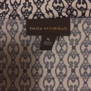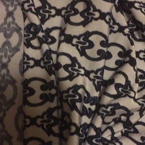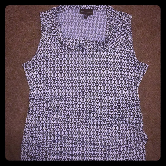 Tunic white background and navy blue scroll design. Slightly cowled neckline and ruched sides.