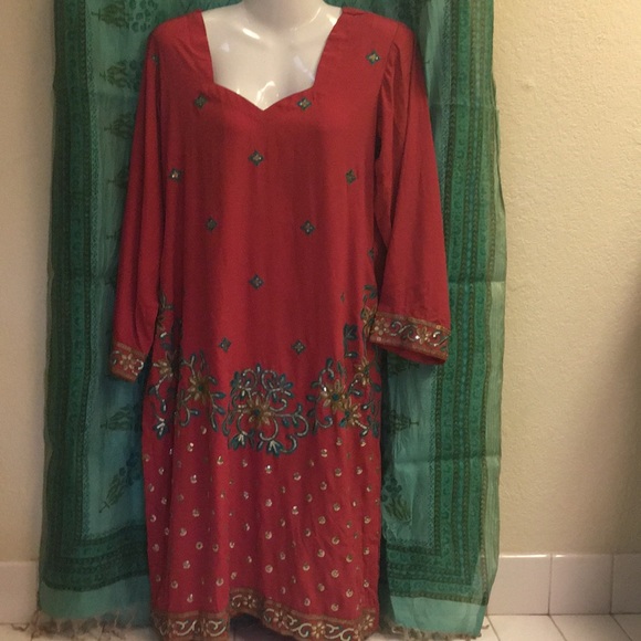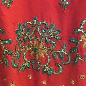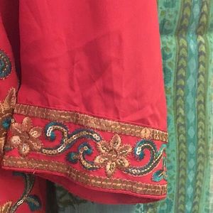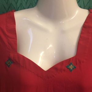 Embroidered red tunic . Soft rayon blend. 17 inched at the shoulders , 18 inches at the waist. Medium to large