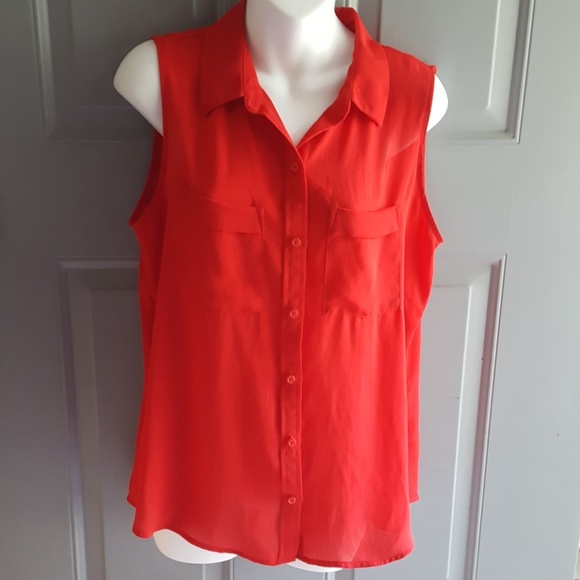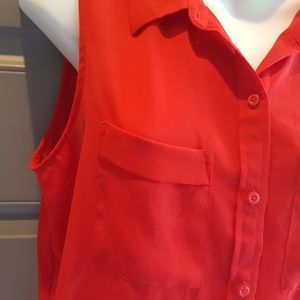 Very pretty button down tunic with pockets. The color is more red than orange which doesn't show as well on the pics but overall red-orange. size M. Flowy fabric. 25 inches from Shoulder to hem