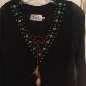 Stunning tunic with studs, turquoise, beads, leather. Polyester black lining with shear overlay and shear long trumpet sleeves. Dry clean. Never worn. Closet raised . Non smoking