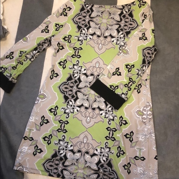 Bold printed tunic or dress depending on preference. Lime green and black boatneck with color block 3 1/4 sleeves. No sizing or brand information, was given to me by a family member. Fits like a 6-8 in women’s