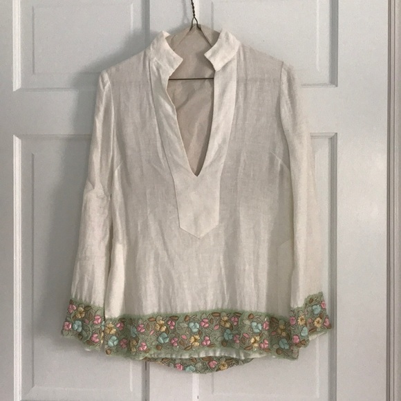 Linen tunic with hand stiched floral detail and beading along bottom of shirt and cuff area