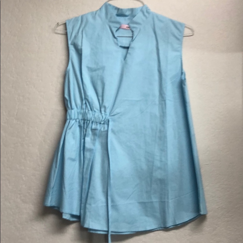 Fashion forward, sky blue, sleeveless tunic with drawstring, never worn