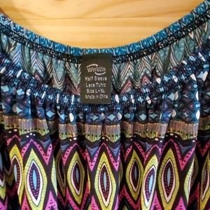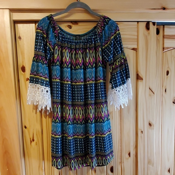 Adorable multicolored tunic with lace sleeves. Looks absolutely gorgeous with leggings & boots or jeans & heels.