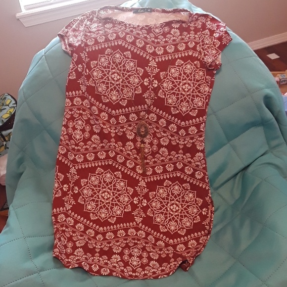 mandala type pattern white with red background. Gold necklace connected.