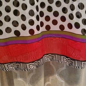 Gauze type material. V neck, super cute with leggings. Red trim embossed ribbon around the V neck. Mixed polka dots and strips.