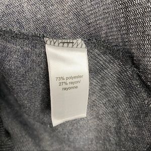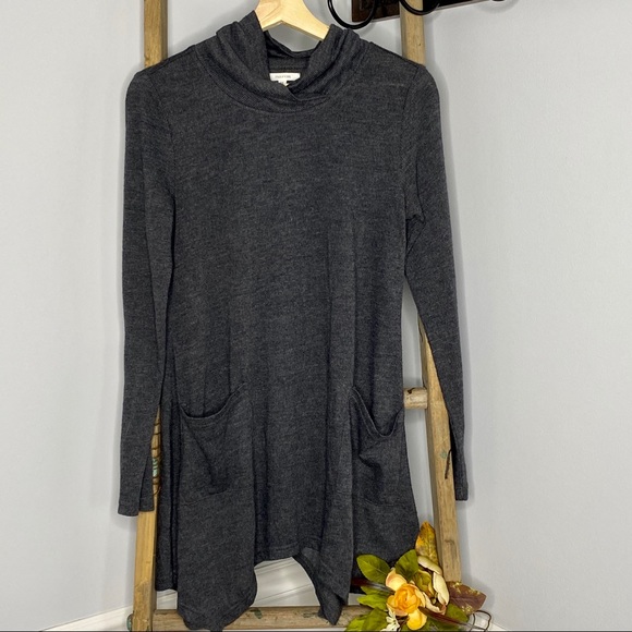 Grey tunic with handkerchief hem line. Slight cowl neck . 2 pockets. Barely worn. 73% Polyester 27% Rayon
