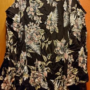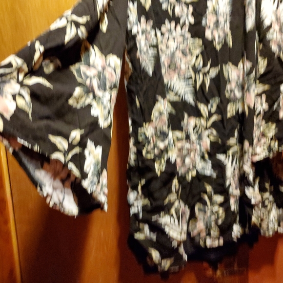Cold shoulder, bell sleeve tunic/dress. Black with ivory, peach, and a hint of taupe color flower pattern.