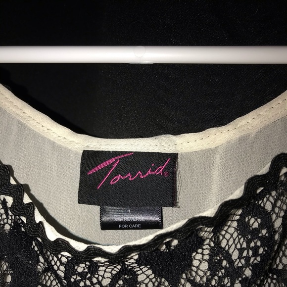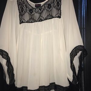 Chiffon Tunic from Torrid. Cream see through top with black lace trim. I believe it’s either a size 1 or 2, but more than likely a 1.