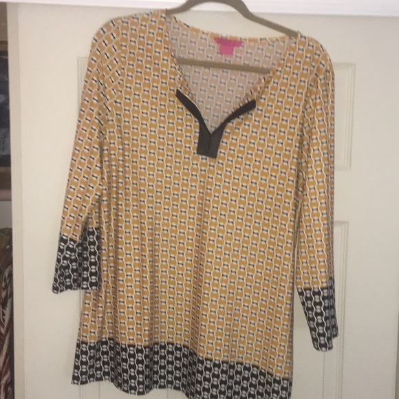 Gold and black tunic top. Three quarter length sleeves. Faux leather detailing at neckline.