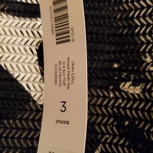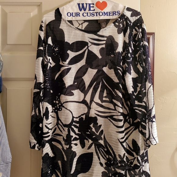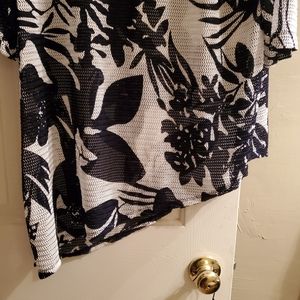 Sheer/Mesh (nylon spandex blend) black and white tunic. Hem gets longer from the left side of the tunic to the right side.